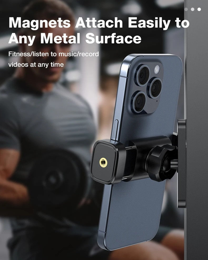 Mount your phone on any metal equipment with 6 industrial-strength magnets. Perfect for filming sets, checking form, or streaming your playlist — all hands-free.